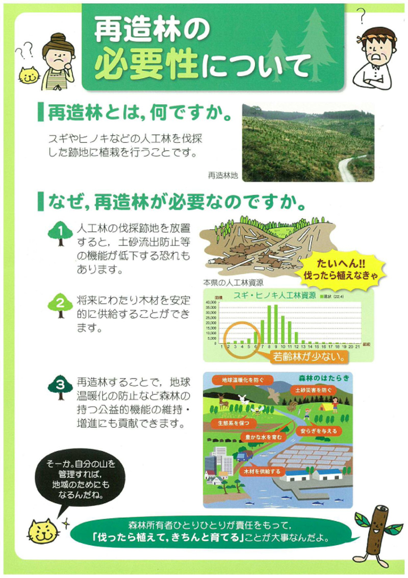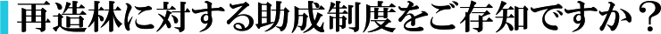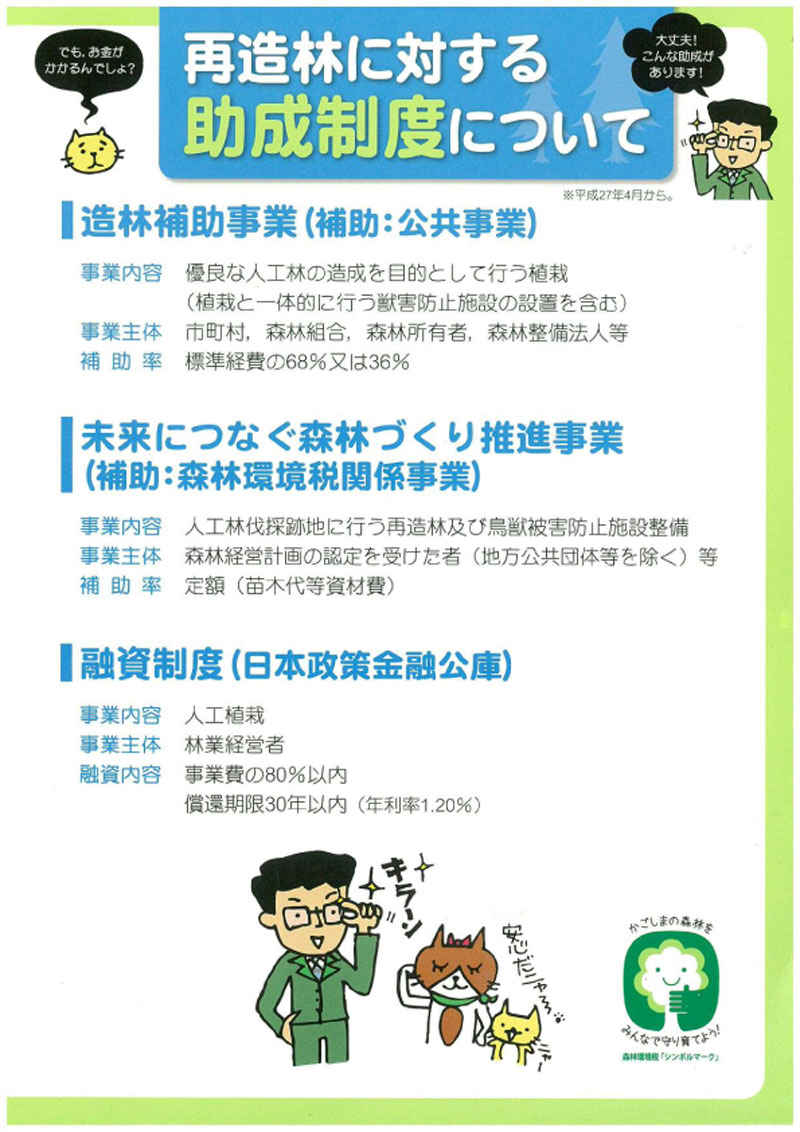 再造林を行うために必要となる苗木代や植え付けに必要となる費用を助成する制度があります。