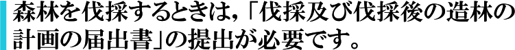 森林所有者などが森林の立木を伐採するときは,伐採を始める90日前から30日前までに森林がある市町村へ『伐採及び伐採後の造林の計画の届出書』を行うことが義務づけられています。