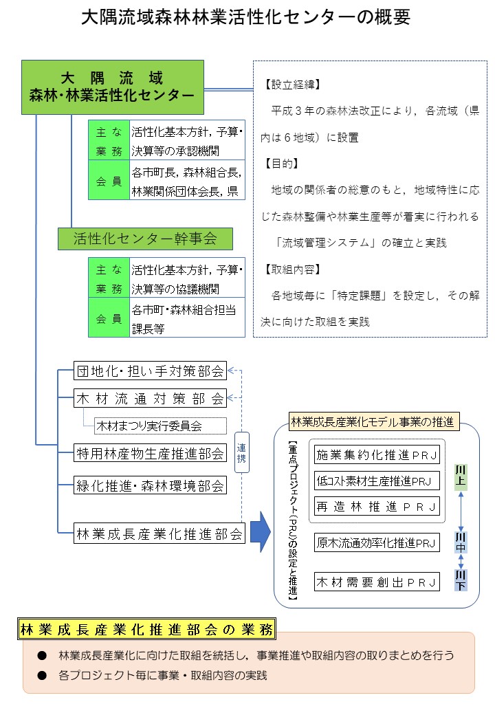 大隅流域森林・林業活性化センターは,大隅地域の各市町長,各森林組合長,林業関係団体の長,県で構成されています。 当センターは,流域内の@低コスト林業の推進,A素材の安定供給,B林業事業体の組織化,C林業労働力の確保,D木材の加工・流通体制の整備,E木材の需要拡大,F緑化の推進,G特用林産の振興など大隅地域の川上から川下までの様々な取組を行っています。 主な取り組みとしては,以下のとおりです。